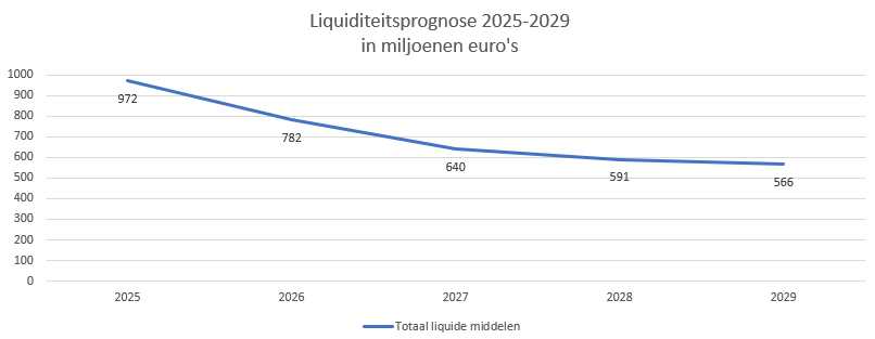Voor de jaren 2025 tot en met 2029 verwachten we een daling van ons liquiditeitssaldo. Een aantal grote incidentele posten zijn: